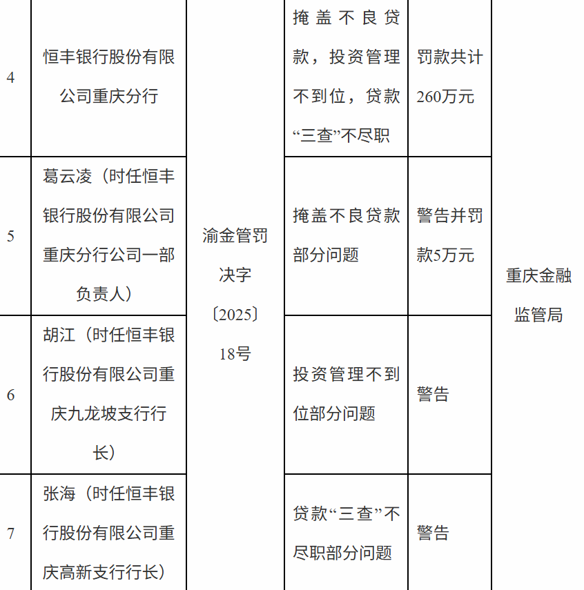 8月20日,国家金融监督管理总局重庆监管局行政处罚信息公开表显示,恒丰银行股份有限公司重庆分行因掩盖不良贷款,投资管理不到位,贷款“三查”不尽职等被罚款共计260万元。葛某(时任恒丰银行股份有限公司重庆分行公司一部负责人)因掩盖不良贷款部分问题警告并罚款5万元,胡某(时任恒丰银行股份有限公司重庆九龙坡支行行长)因投资管理不到位部分问题被警告财新网,张某(时任恒丰银行股份有限公司重庆高新支行行长)因贷款“三查”不尽职部分问题被警告。